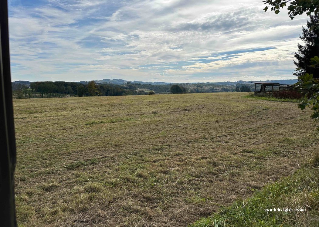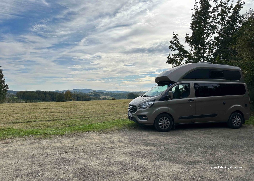Schöner, ebener Schotterplatz mit tollem Ausblick. Es gibt mehrere Möglichkeiten in den Wald zu gehen, um zum Beispiel mit dem Hund spazieren zu gehen. Der Parkplatz liegt an einer sehr wenig befahrenen Straße.