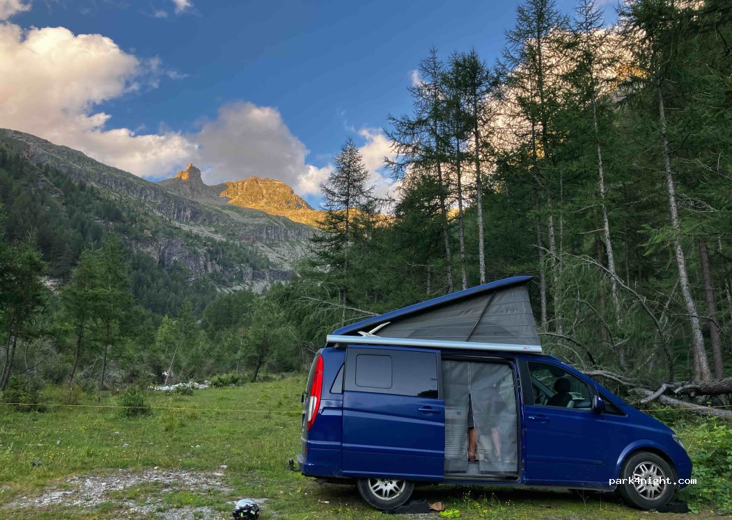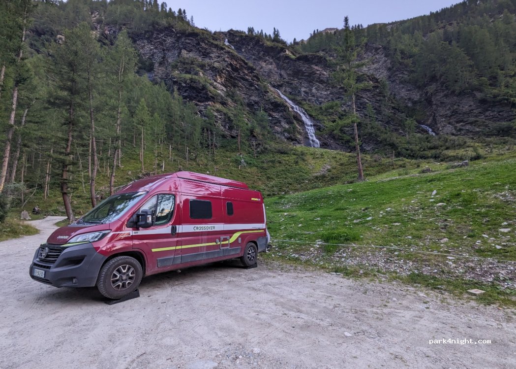 Prachtige locatie, super rustig, na nuttigen van de maaltijd in de hut mochten we op de parking blijven staan. Dag nadien terug gekomen. We stonden niet alleen, maar er is meer dan plaats genoeg om elkaar niet te storen. Bereikbaar via steile gravel weg, enkel voor kleinere campers. S’ochtends vanaf 10u bezoekers voor goudzoekersdorp. Startpunt wandeling naar een meer hogerop.