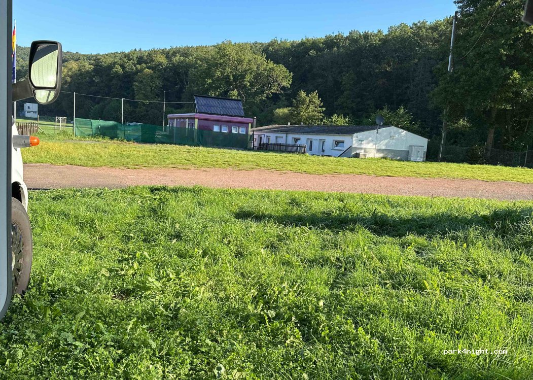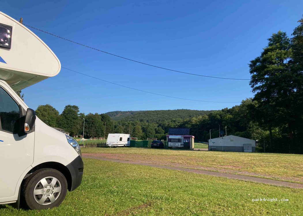 Offener, ruhiger Platz auf Rasen am Bach. 1 WoMo 2 Personen, Strom und Dusche 23 €. Ver-und Entsorgung möglich.