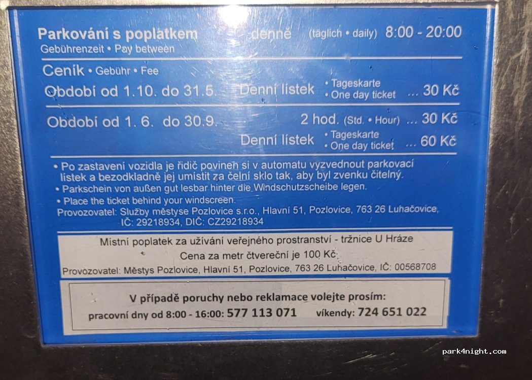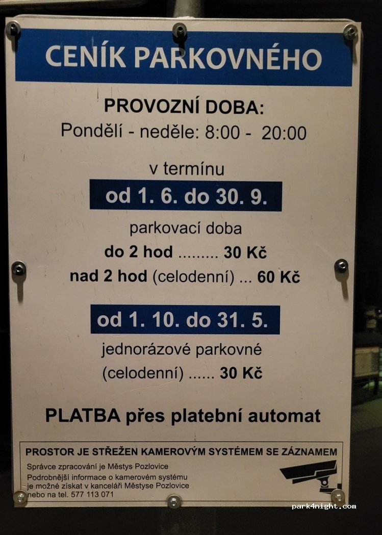 Dostatečně velké parkoviště, ale je dost z kopce. Zákaz pro obytky tady není, takže parkování i přes noc je legální. Platí se jen přes den (8-20), noc je zdarma. Dle ročního období je cena buď 30 nebo 60 Kč za den. V noci téměř prázdné, jednu noc sami, druhou noc 1 obytka. Přes den (byly Velikonoce) je tu ale úplně plno.