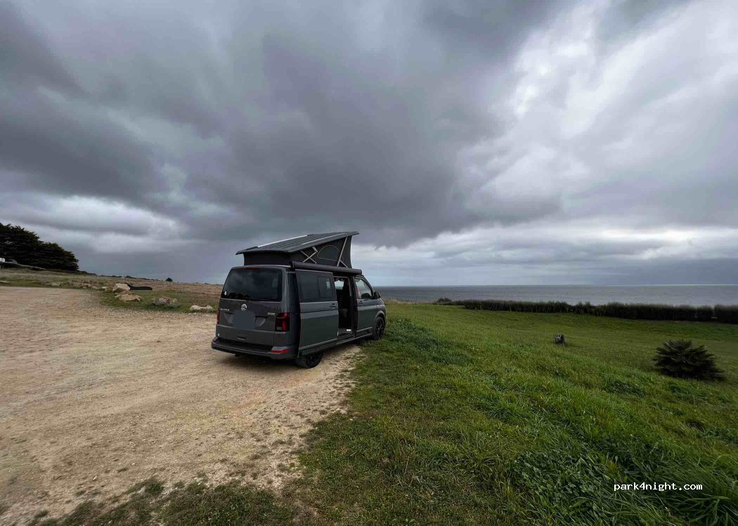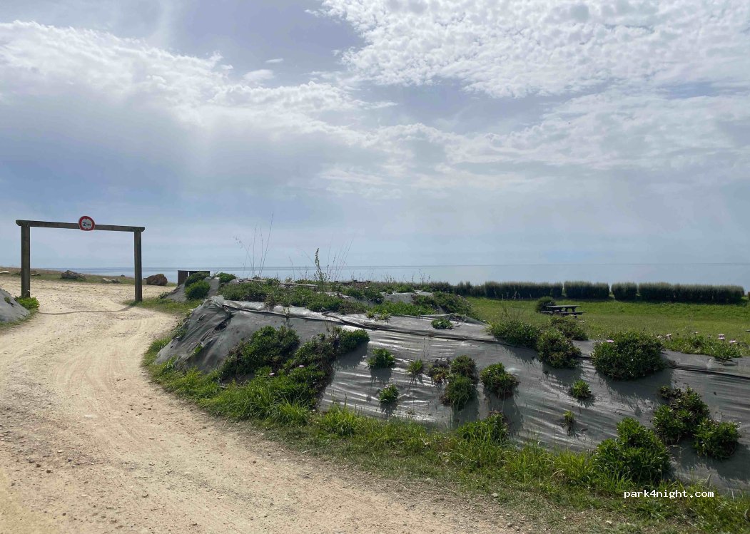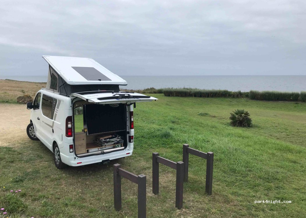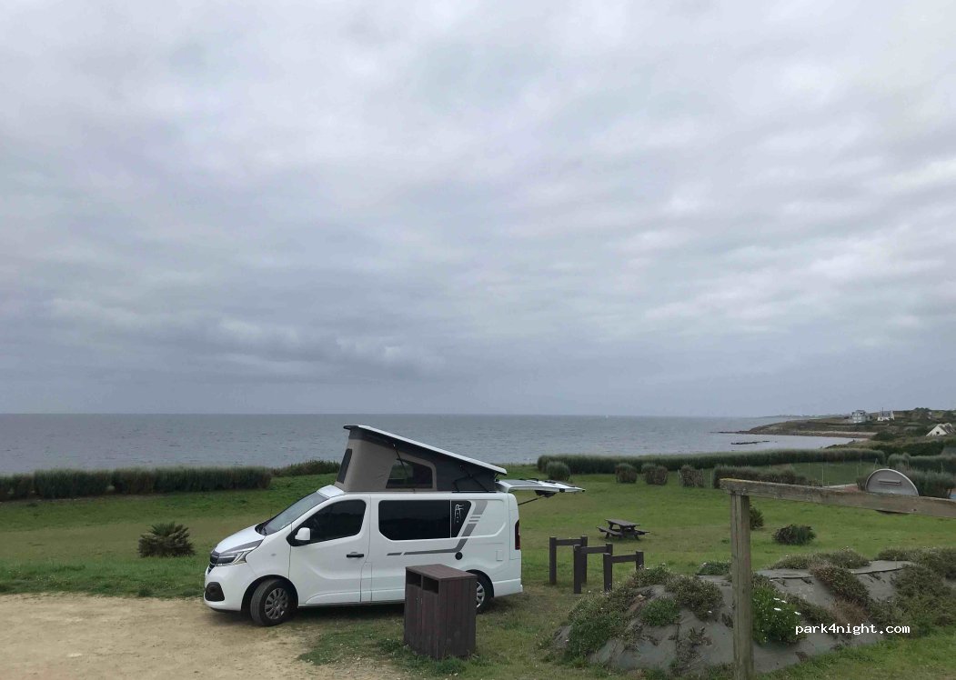 Aire sans restrictions apparentes. Barrière de 2m. 2 Table de pique nique . Endroit calme avec vue. Accès à la plage sur le deuxième plus bas. Poubelles emballages / verres et ordures ménagères sur le parking du bas. Possibilité de faire balade sur les chemins côtiers. Légèrement en pente mais deux places à plat.