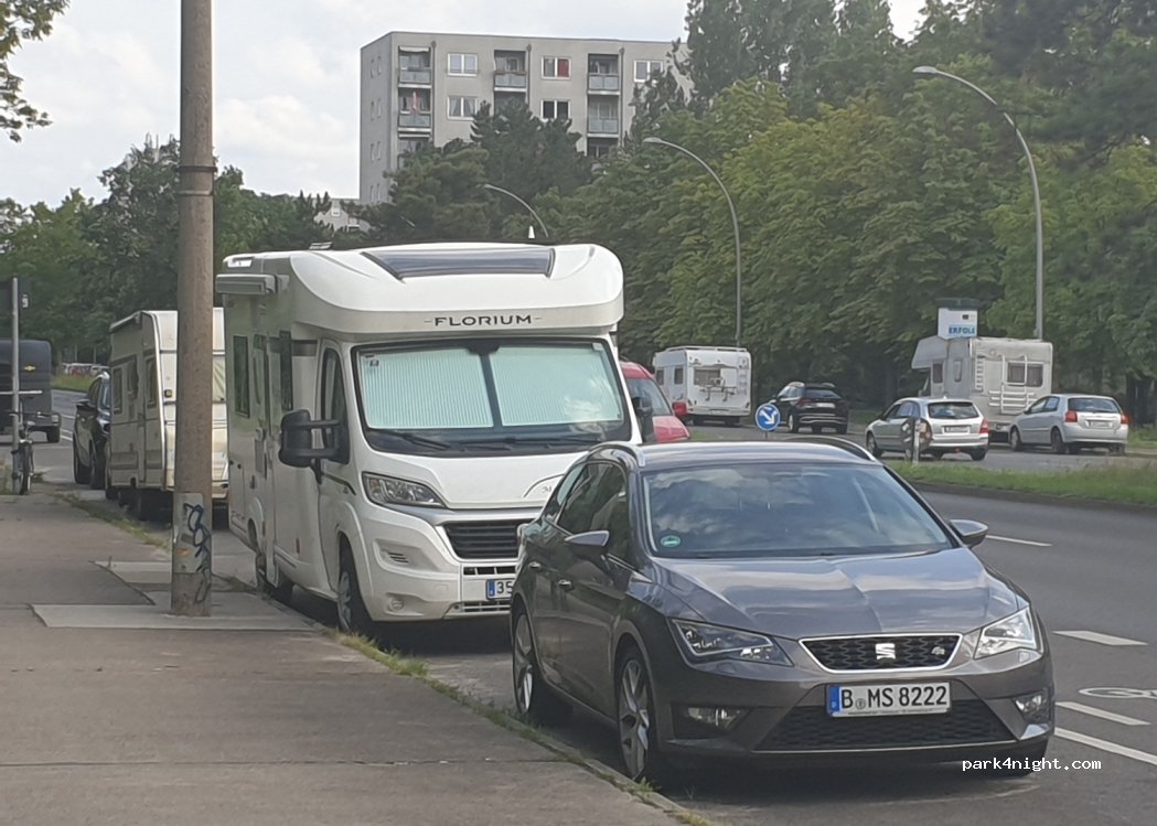 Avenue de Berlin où se garent de nombreux climatiseurs des voisins. Gratuit. Transports publics vers le centre voisin ainsi qu'ALDI et REWE à l'intersection avec la rue Edisonstrabe.