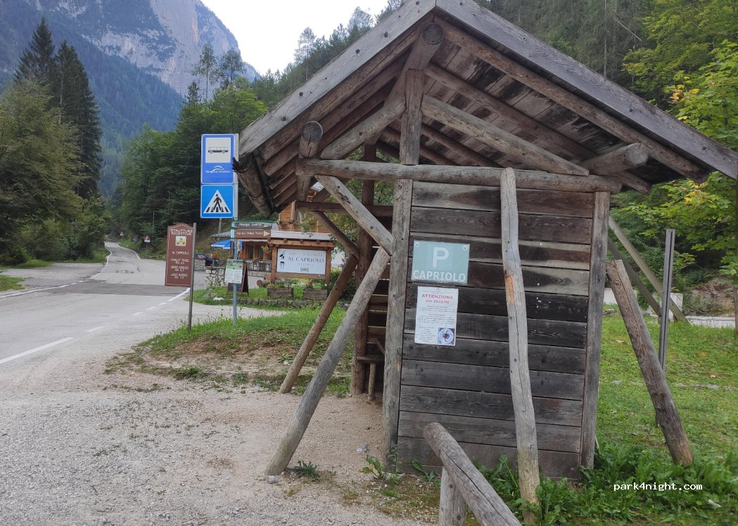 P5 Parcheggio caprioli per il Lago di Tovel. È il penultimo parcheggio dove possono parcheggiare i camper. Il successivo P4 è comunque solo 500 metri più avanti ma vige il divieto di sosta notturna.