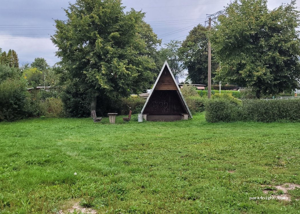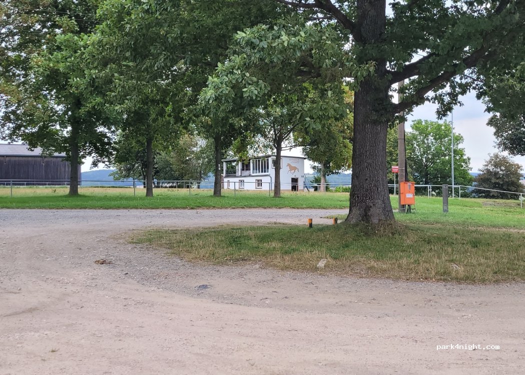 Ruhiger Ort an Gartenanlage und Reitplatz. Schöne Aussicht mit Bank und Mülleimer.