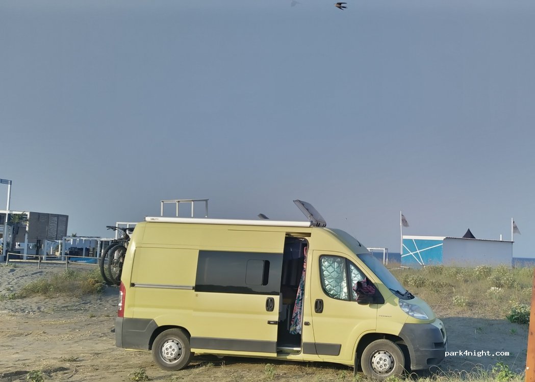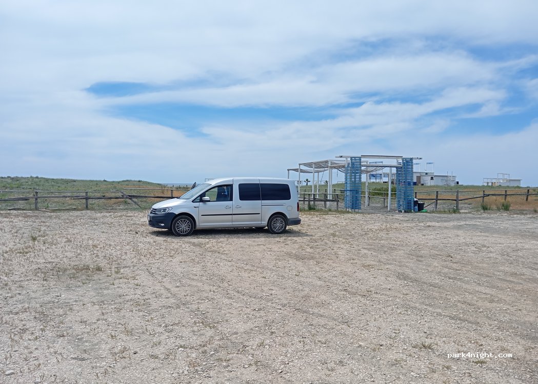 We spent here calm night in mid june, on workday. Parking is flat, sea shallow. In season or during weekend i can imagine, it could be busy in night due to music from beach clubs... in emergency i would choose wide access roads for night.
