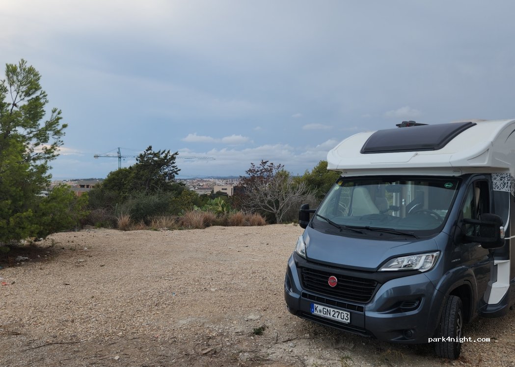 Aparcamiento de gravilla con vistas al mar. Extremadamente silencioso. Sin señales de prohibición. Ligeramente inclinado en algunos lugares. El aparcamiento podría estar un poco más limpio.