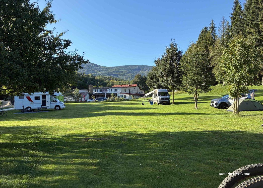 A great, friendly campsite. Excellent bike park. Toilets and showers open 24 hours a day. Small restaurant. Cultural events in the evening at weekends. Free parking in front of the campsite during the day only. At the campsite: 170 CZK/night for a van. 320 CZK/night for a motorhome.
