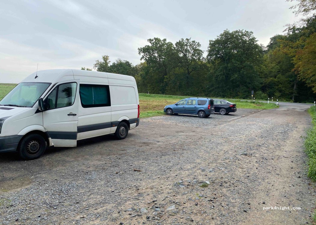 Für eine Nacht in Ordnung. Wie schon gesagt wurde, sind hier vor allem morgens Berufsverkehr und Gassigänger zu erwarten. Aber es fahren eigentlich immer mal vereinzelt Autos auf der Landstraße vorbei, egal zu welcher Uhrzeit. Am besten so weit wie möglich von der Straße weg stellen auf dem Parkplatz. Dann finde ich geht es. Ansonsten recht ebener Boden. Schön nah am Waldrand.