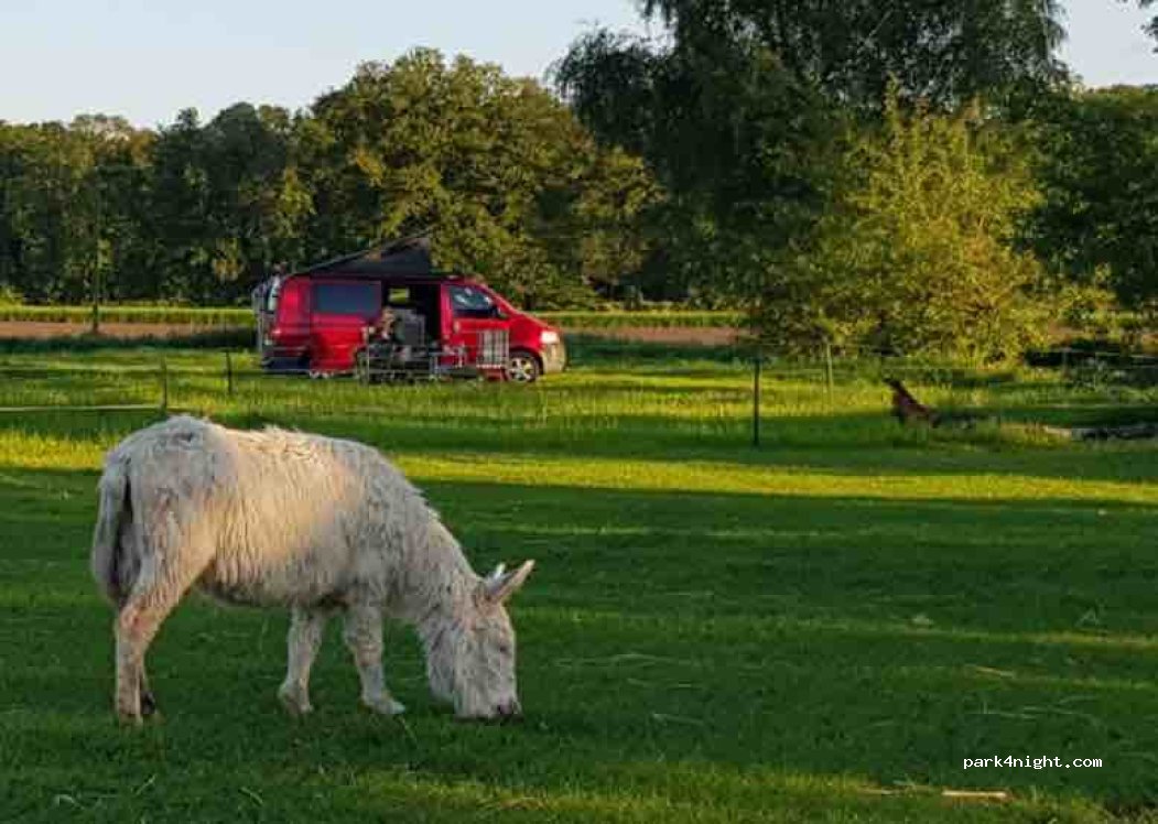 Plek voor maximaal 3 kleine campers. Op een weilandje achter de boerderij, naast de ezeltjes. Wij werden hartelijk ontvangen en kregen tips en ideeen voor onze middag en de fietsroute naar Xanten. Voor de avond kregen wij een vuurschaal en extra brandhout. WC en douche (met zeepjes en handdoeken) in de boerderij op 100m loopafstand en stroom werd geregeld via een haspel.
