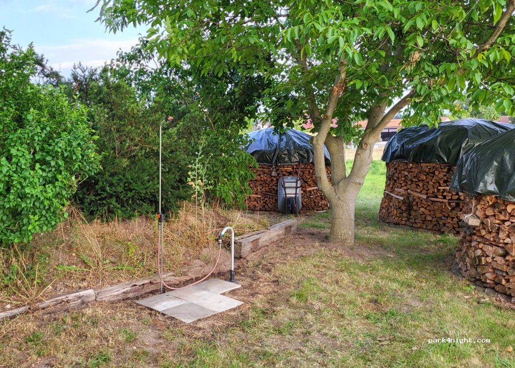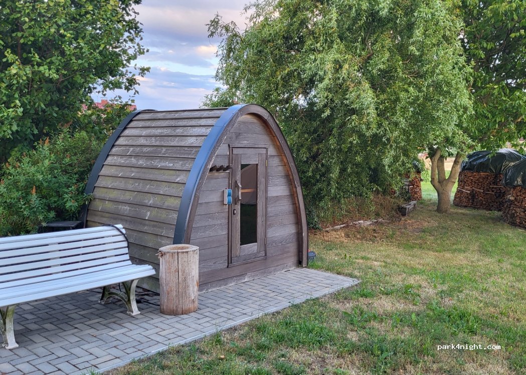 Eine kalte Außendusche ist auf der Streuobstwiese vorhanden. Die Außensauna kann gegen eine Gebühr genutzt werden.