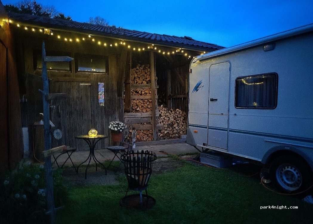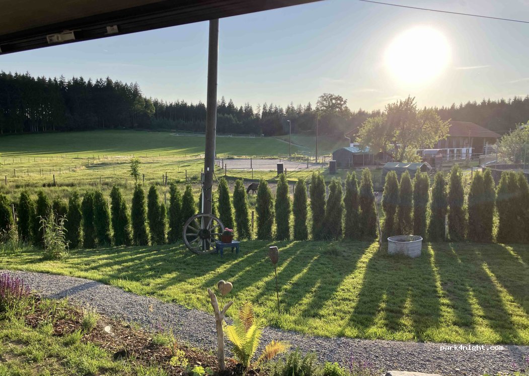 Wunderschöner Gartenstellplatz mit einem fantastisch weiten Ausblick über die Wiese bis zum Wald. Ein sehr freundlicher, herzlicher Empfang mit liebevoll zusammengestellten Informationen (wie z.B. eine Tabelle mit Gaststätten usw.) Ein Tisch mit Stühlen - die benachbarte Scheune ist Abends stimmungsvoll illuminiert - einfach traumhaft schön - eine 5* Wohlfühloase inmitten einer intakten Natur.