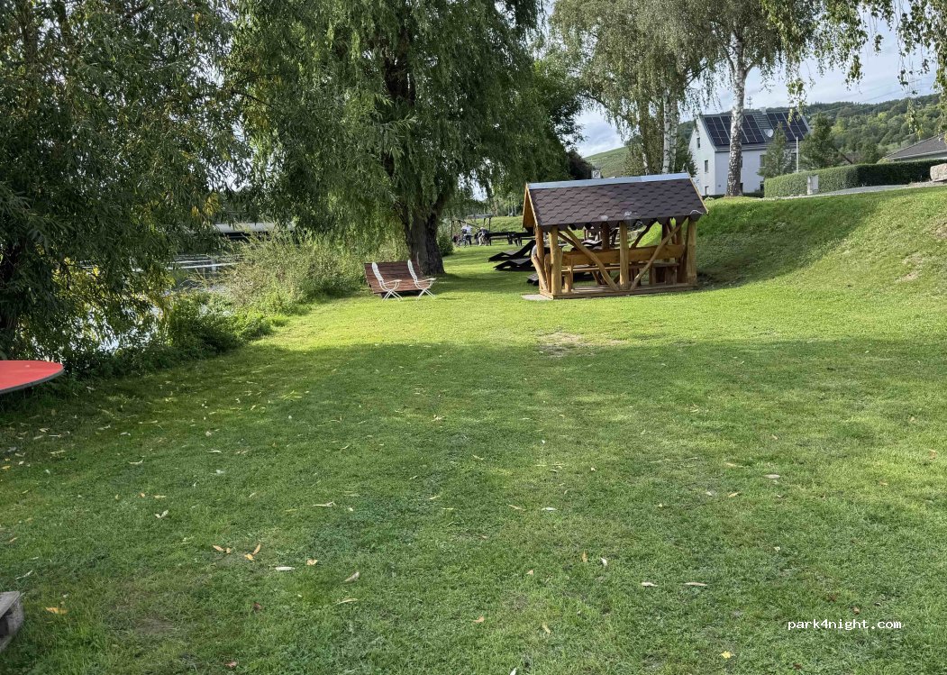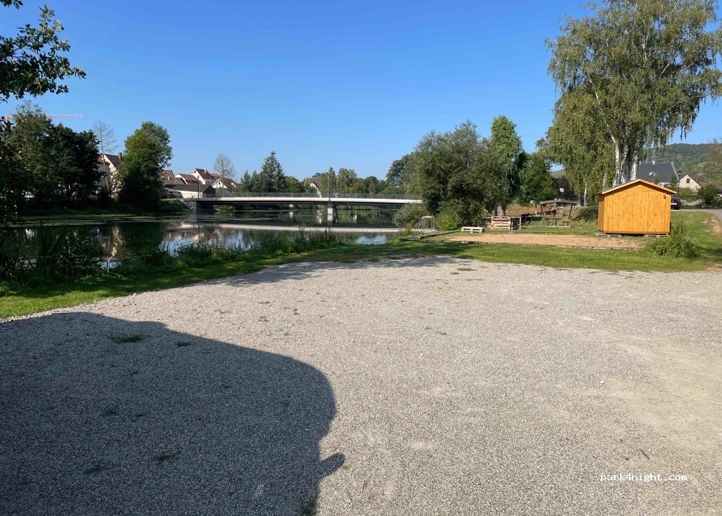 Parking lot for 3-4 cars/mobile homes located directly on the river (Tauber). Location directly between the bathing and Kneipp facilities and a children's playground. Relatively quiet area except for light traffic on the nearby bridge and the chimes of the church spire across the river.