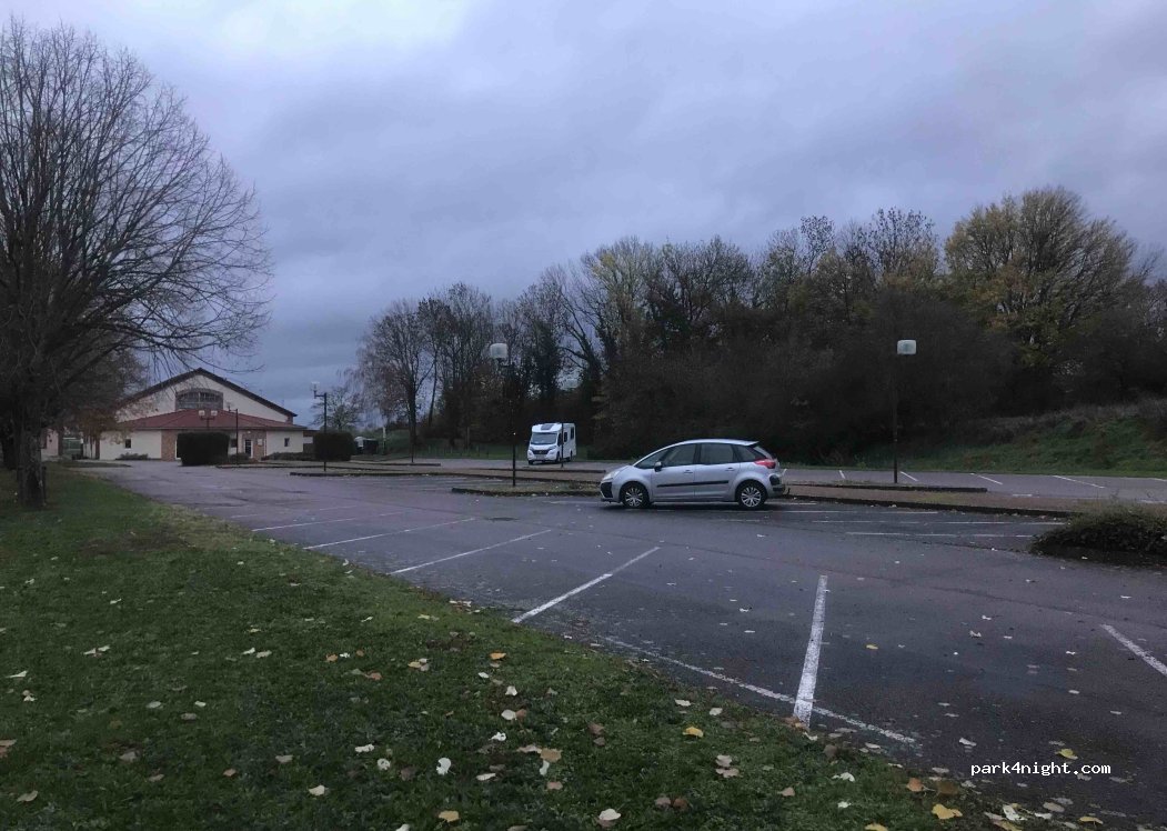 Parking salle polyvalente et stade de foot. calme la nuit , proximité village, stade, aire de jeux .... emplacement plat et quelques places à l ombre ...