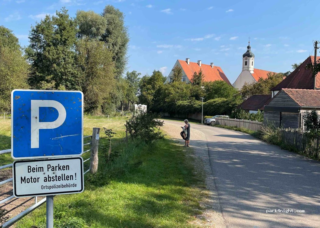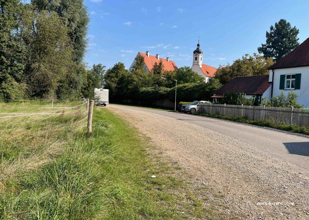 A parking lot behind the baroque church of Gutenzell, mostly level and gravel. We stood overnight without any problems, very quiet, only the ringing of the bell can be heard. In the monastery district, after visiting the church, the restaurant "Klosterhof" is highly recommended