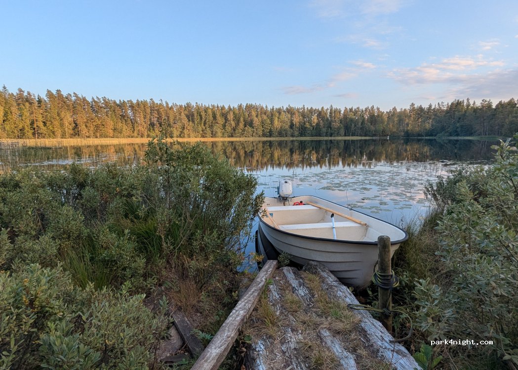 Pequeña plaza de aparcamiento para autocaravana no muy lejos de la carretera. Vista bonita al bosque y al lago. No hay suministro alguno. Encuentro de alces y ciervos.