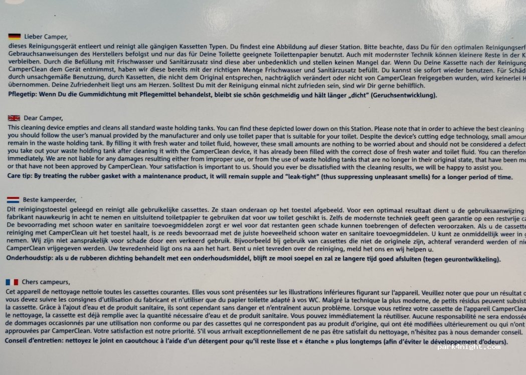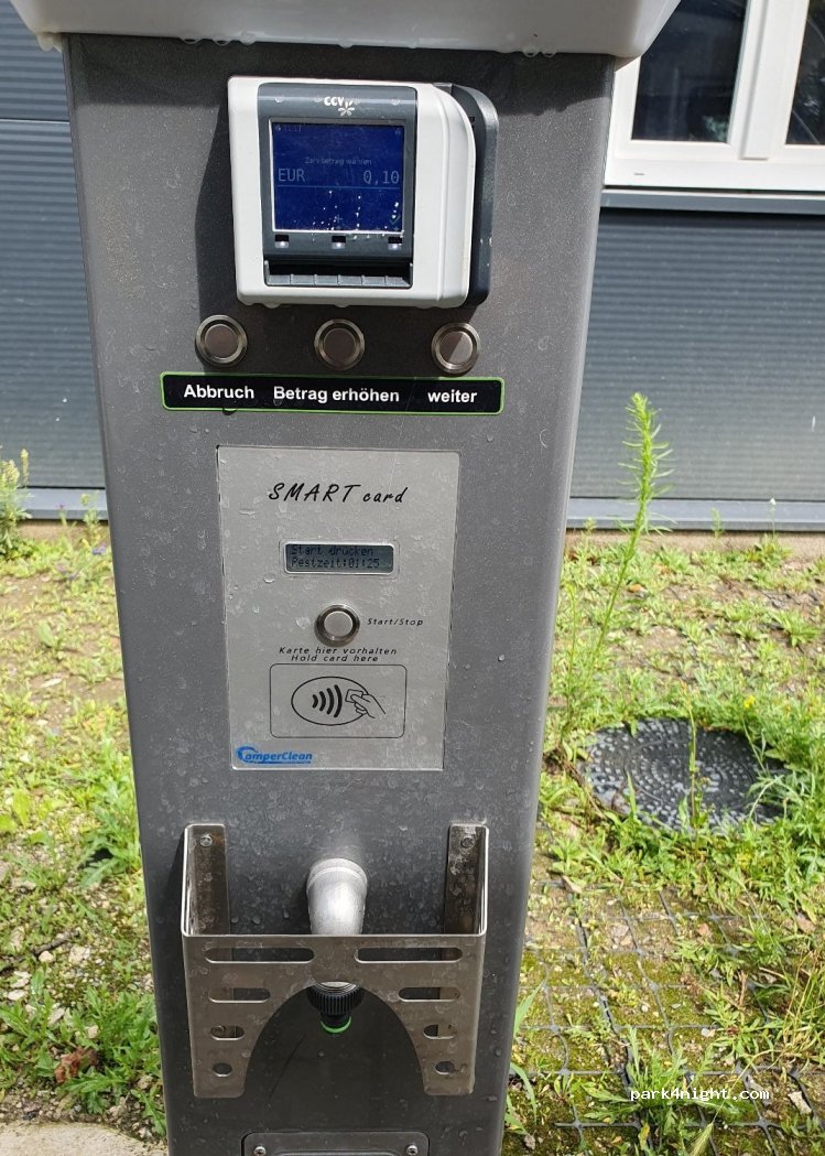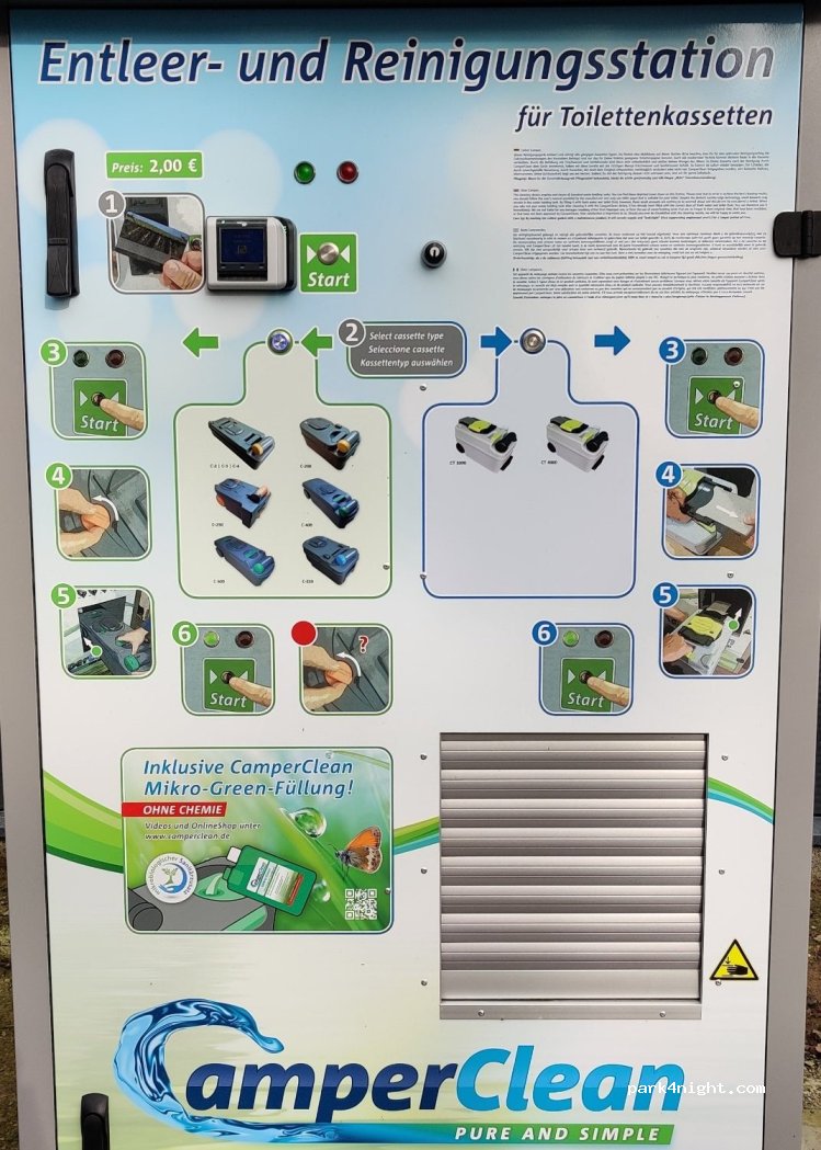 The camper clean automat is card only no cash. Took awhile before it recognised I wanted to buy the service. The toilet cassette was only like 95% cleaned still something left. Emptying grey water was no problem