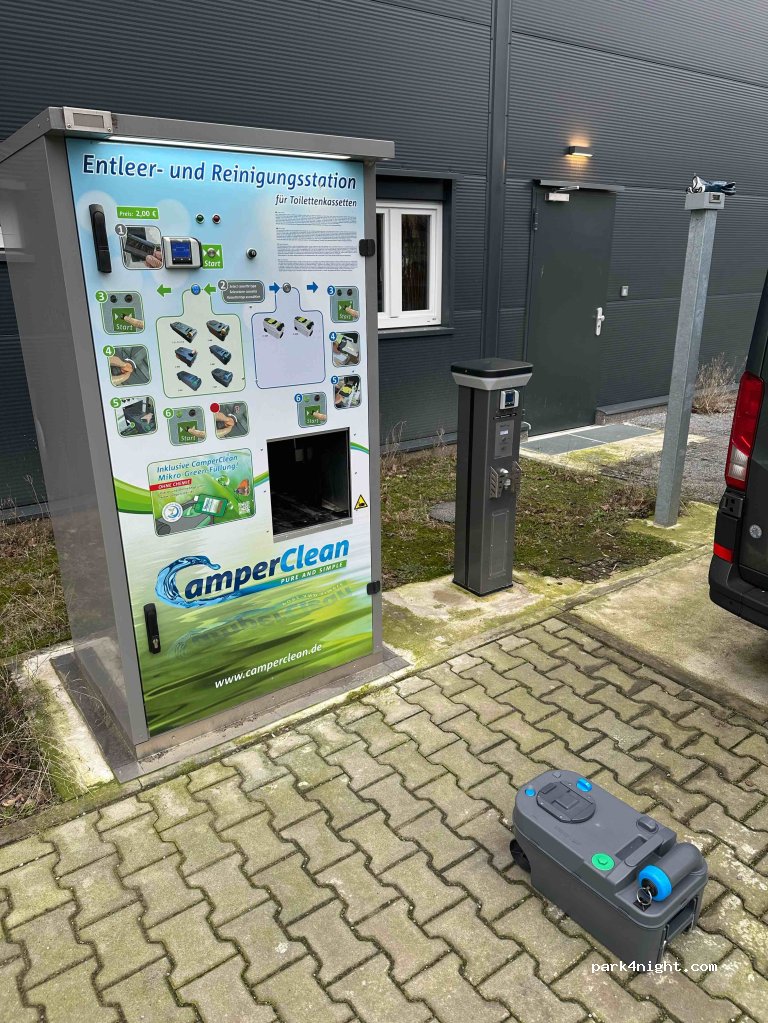 Bei Carbotec auf dem Hof ist die Serviceanlage. Dort kann auch geparkt werden. Keine Höhen- oder Längenbegrenzung. Fahrzeuge mit Tanks entsorgen kostenlos. Automaten für Entsorgung und Frischwasser sind Öffnungszeiten unabhängig.