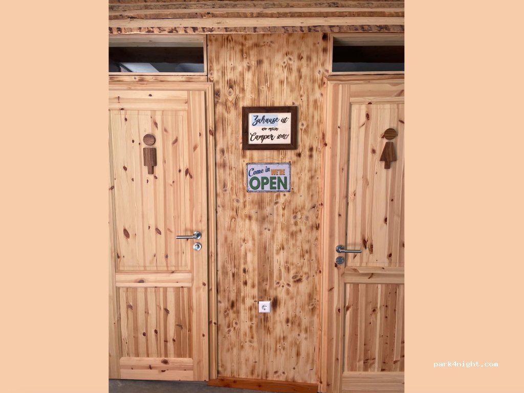 Was für ein toller Empfang! Was für ein schöner Stellplatz (trotz Dauerregen). Die sanitären Anlagen sind neu und sehr gepflegt. Es gibt innen einen kleinen Schrank. Dort stehen Getränke zu einem fairen Preis bereit. Mancher Campingplätze kann sich hier eine große Scheibe abschneiden. TOP!