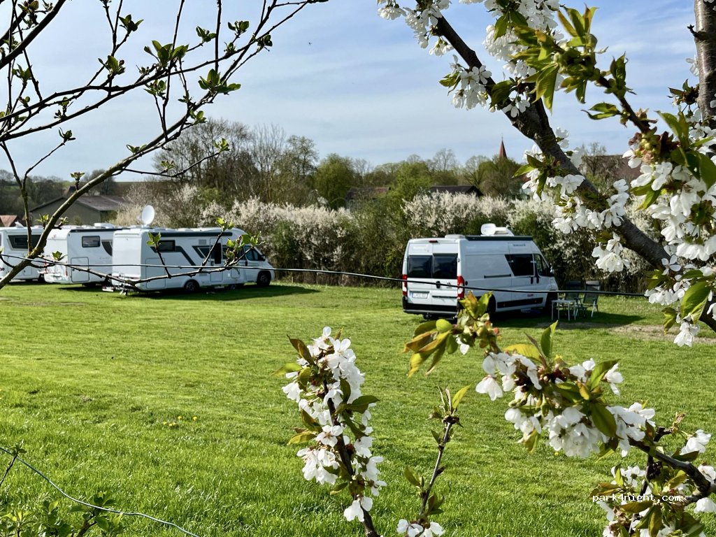 Jammer genoeg was het gras nog erg nat waardoor het niet berijdbaar was. Maar aan de rand met de linkerwielen op de bestrating goed gestaan. Alles is even netjes en zeer schoon. E-bikes zijn gratis in de schuur op te laden. Voorzieningen ook prima in orde en super schoon. Mooie fietstocht naar Rothenburg a.d.T. gemaakt.