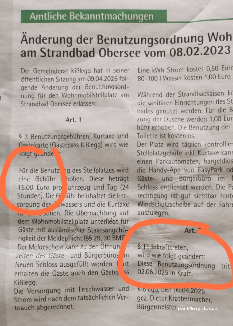 Aktuell kostet dieser Platz 11 Euro. Dafür hat man tagsüber öfters den Lärm der angrenzenden Beton Firma. Nun soll der Tagespreis laut Beschluss des Gemeinderates ab 02.06.25 auf 15 Euro erhöht werden. Absolute Frechheit für das was geboten wird. Wir werden diesen Platz in Zukunft meiden und hoffe, das dies mehrere tun, damit der Gemeinde ihr Höhenflug bewusst wird.