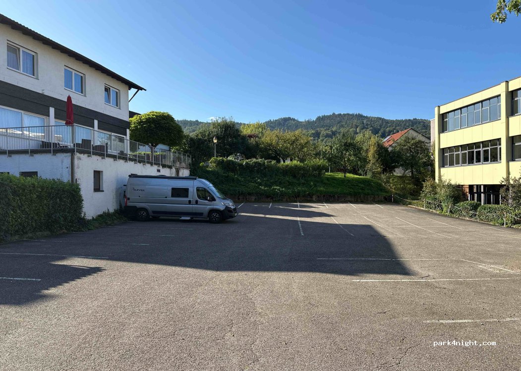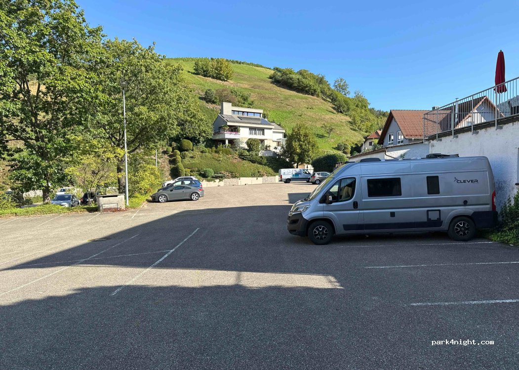 Parking calme le week-end car juste à côté d'une école, sans doute plus bruyant en semaine. Tous les endroits ne sont pas plats. Pas de V/E. Bonne réception du téléphone portable. Assurez-vous de manger et de boire du vin au Strausswirtschaft Falkenhorst (Besenwirtschaft). Attention, il n'est pas ouvert toute l'année. Vérifiez-le au préalable sur le site