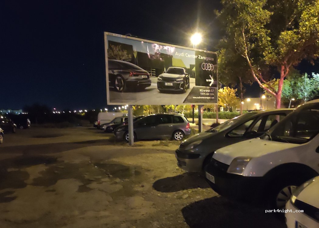 Párking de tierra con iluminación media y tranquilo,junto a una vía de circulación. y un parque