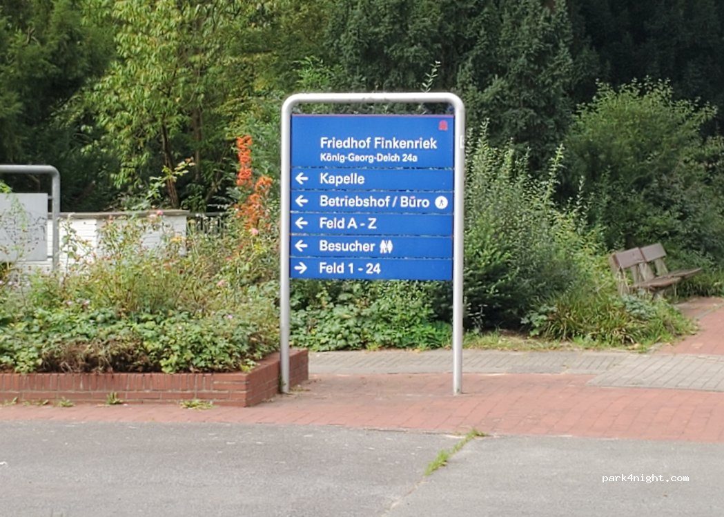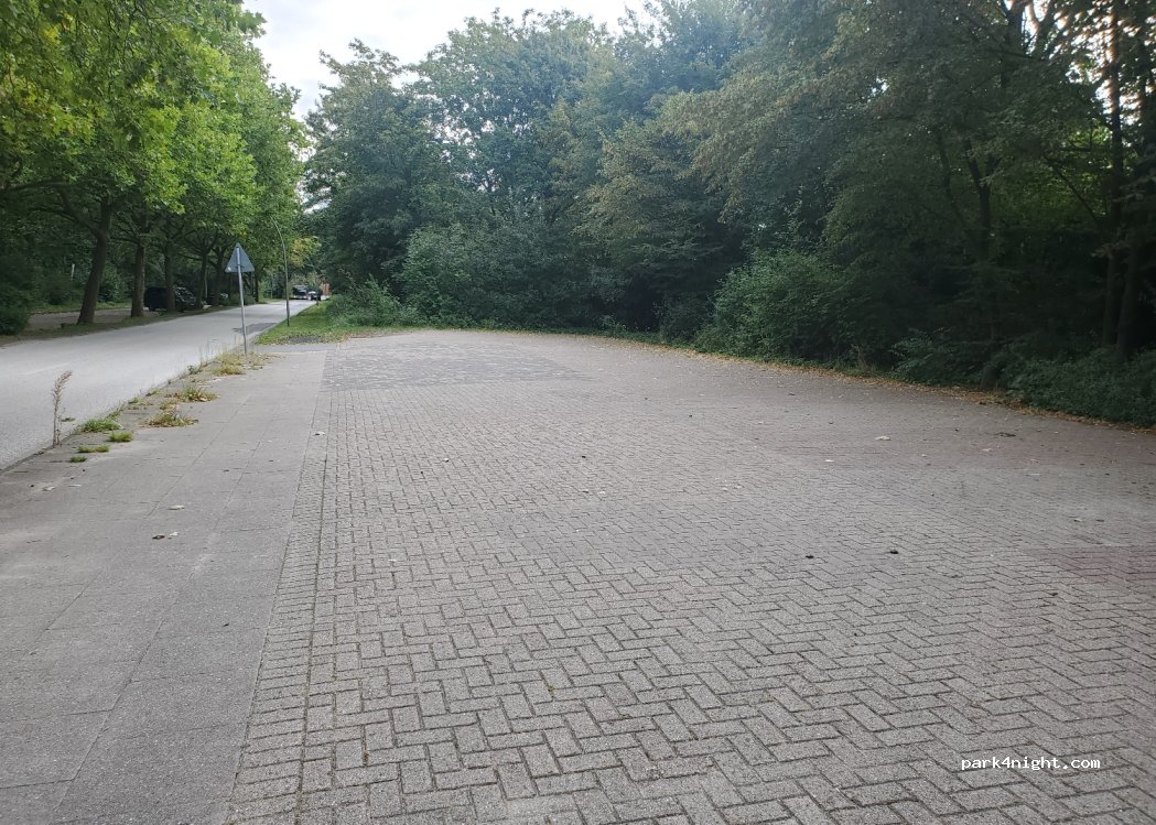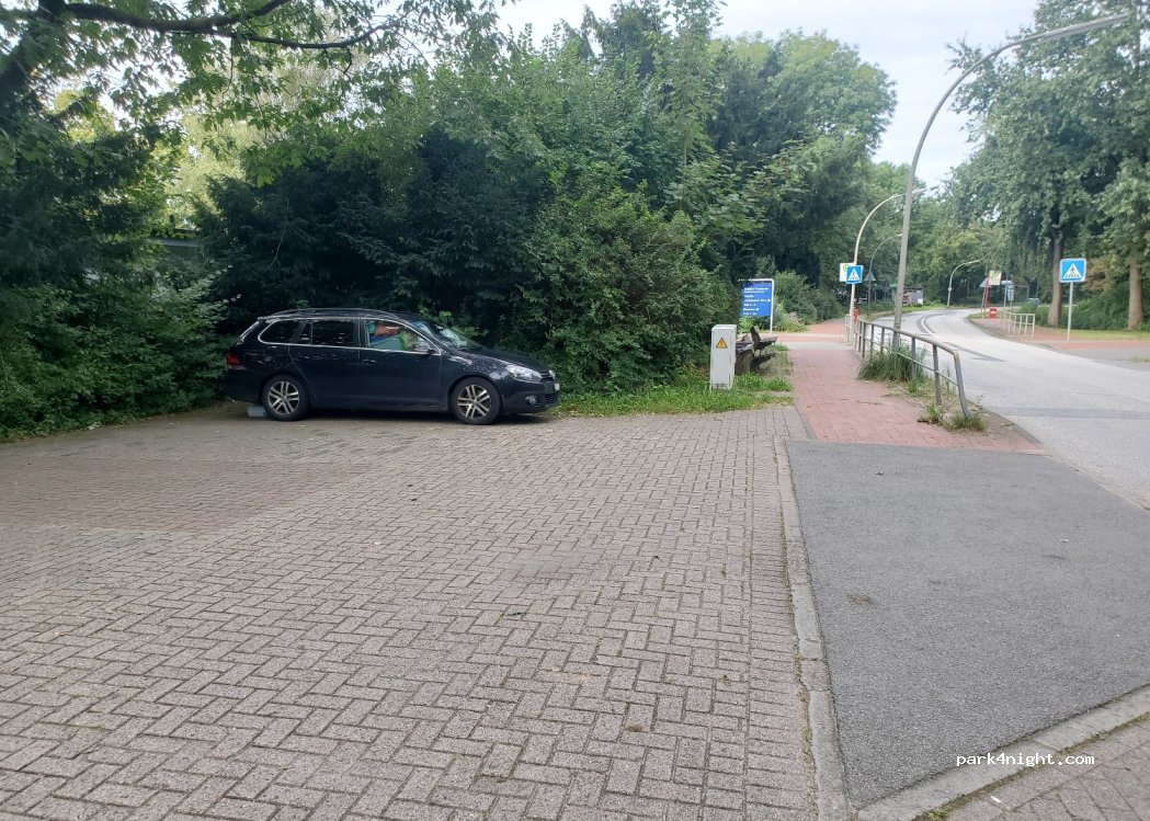 A quiet free parking lot. Nicely located between trees and bushes with no view of industry. Probably belongs to the cemetery parking lot, which is across the street. 50m further there is a bus stop. Pass the cemetery and then left on the Georg-König-Weg and in 5 minutes you will reach the South Elbe with a small Elbe beach where you can even swim.