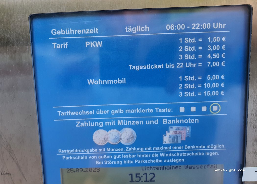 Ausgangspunkt für Wanderungen zum Kuhstall. Barzahlung. Die Maschine profitiert von einem Sondertarif für Camper. Der Tarif gilt für maximal 3 Stunden, es ist unklar, ob ein längerer Aufenthalt erlaubt ist.