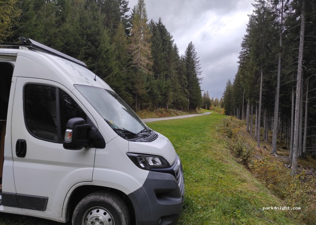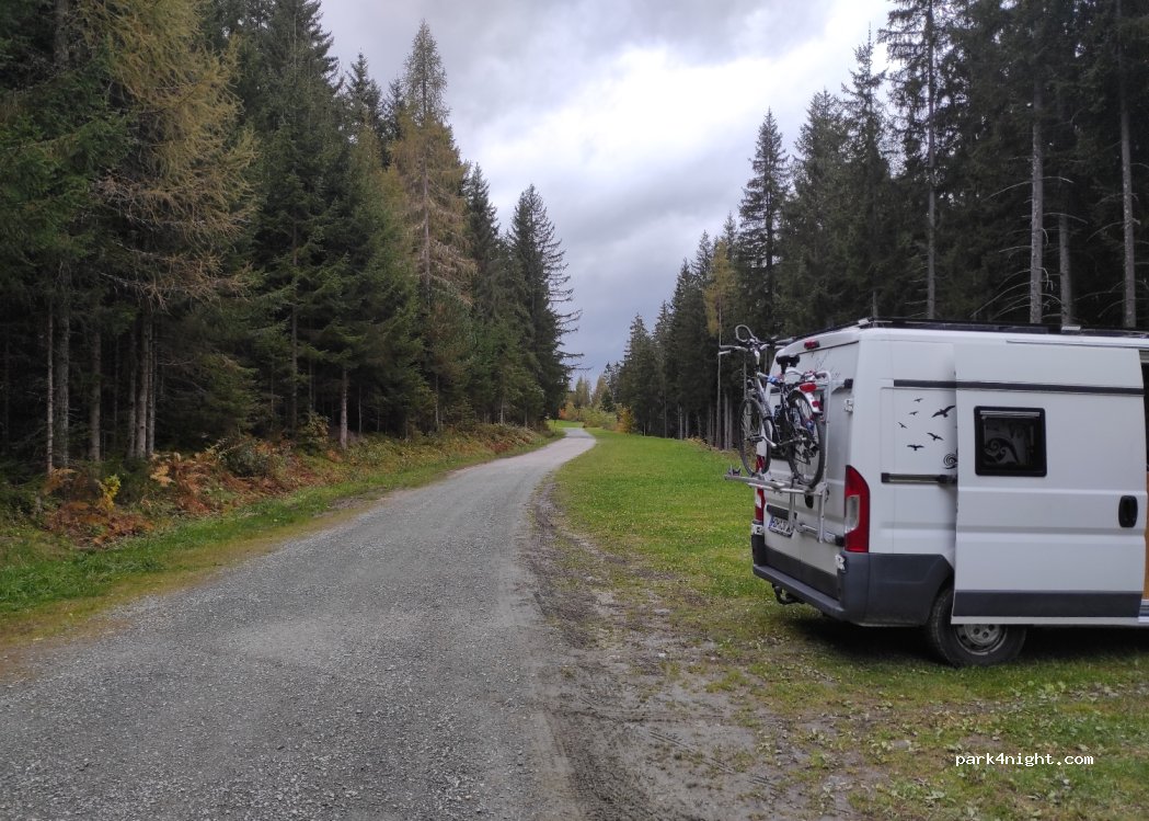 Aparcamiento en la estación de montaña de Rohrmoos II (señalizado). En algunos tramos del aparcamiento hay una ligera pendiente descendente. Cerca de la carretera, pero con poca afluencia. Rodeado de bosque y con mucho canto de pájaros.