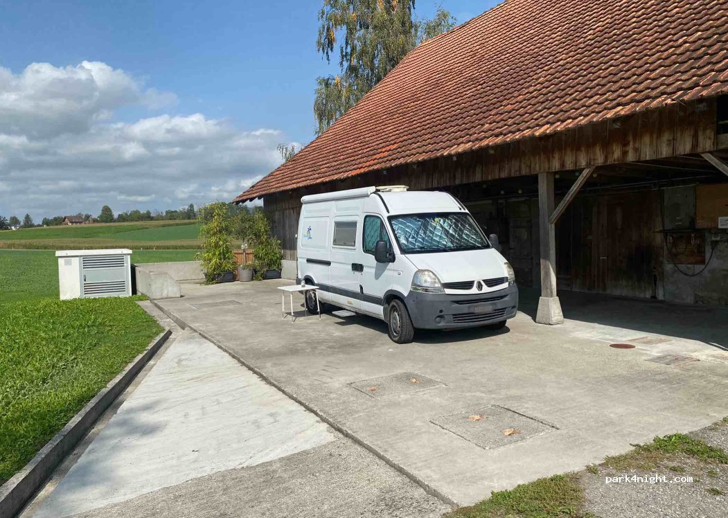 Sommes arrivés sous une averses de pluie et il n y avait personne mais c est de ma faute je n avais pas vu qu il m avait envoye un mail nous prévenant qu il n était pas là avec les explications nécessaires .avons passés une très bonne nuit au calme avec une belle vue le matin .nous avons fait connaissance le matin de Tony et sa femme qui sont très agréable.avons pris un café et une part de gâteaux qui sont mis à disposition en laissant ce que l on veux .on a payé 50 e pour la nuit , un peu cher mais c est la Suisse