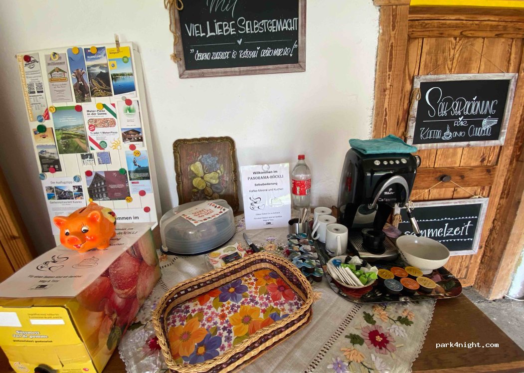 Die herzlichen Gastgeber machen alles möglich, was man braucht. Es ist ruhig dort oben, man hat eine tolle Aussicht und viel Platz. Übernachtung im Van kostete mit Strom 45 CHF/Nacht, Getränke und Kuchen sind auf Spendenbasis. Wirklich tolle Leute, wir kommen gerne wieder!