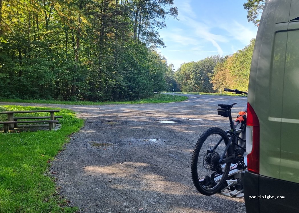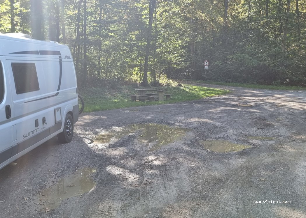 Wanderparkplatz, direkt an der strasse, Mülleimer, Picknick-sitzgruppe. tagsüber Durchgangsverkehr, nachts ruhig