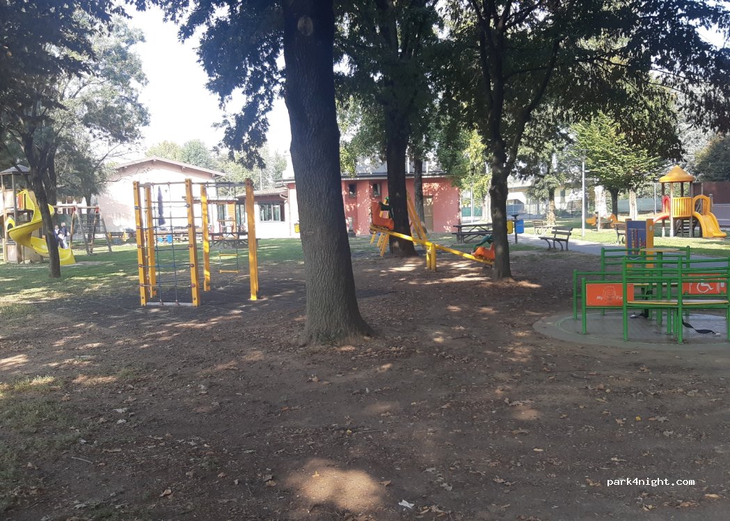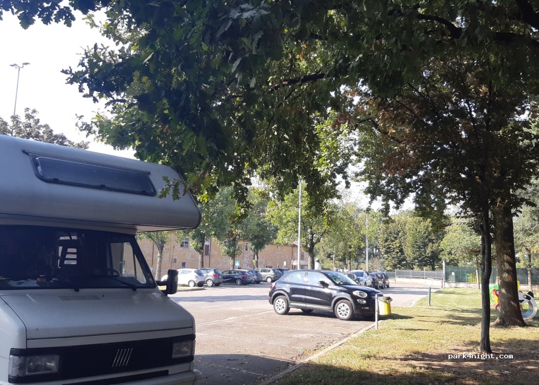 Parcheggio misto auto in prossimità di un bar, adiacente un parco giochi. Zona tranquilla peccato che le campane alle 6:30 ci hanno svegliati.
