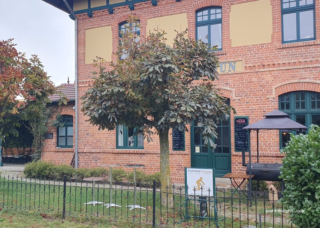 Dans l'ancienne gare de Dargun, aujourd'hui café (voir internet pour les horaires d'ouverture). Netto (noir) avec boulangerie et Norma accessibles à pied. Emplacements sur pelouses en gravier. De là, visitez les ruines du monastère, balades en tramway en été, randonnée autour du lac Dargun avec possibilité de baignade sur la plage.