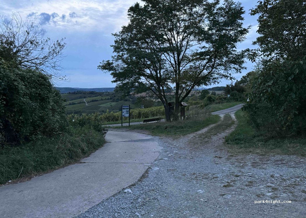 Ein kleiner Wanderparkplatz oben in den Weinbergen mit toller Aussicht. Wir hatten eine ruhige Nacht mit einem weiteren Camper. Die Anfahrt ist über eine schmale aber befestigte Straße, lediglich die Einfahrt in die Straße ist eng, aber wir konnten mit unserem 6.40m Kastenwagen ohne Probleme dort lang fahren.