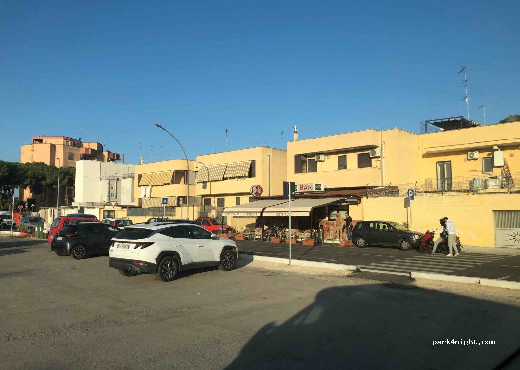 Amplio aparcamiento gratuito. No dormimos pero desayunamos excelente en la pastelería La Belle Epoque de enfrente. Se encuentra a 5' del enlace de la autopista hacia Bari.