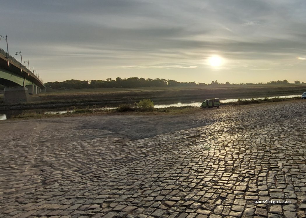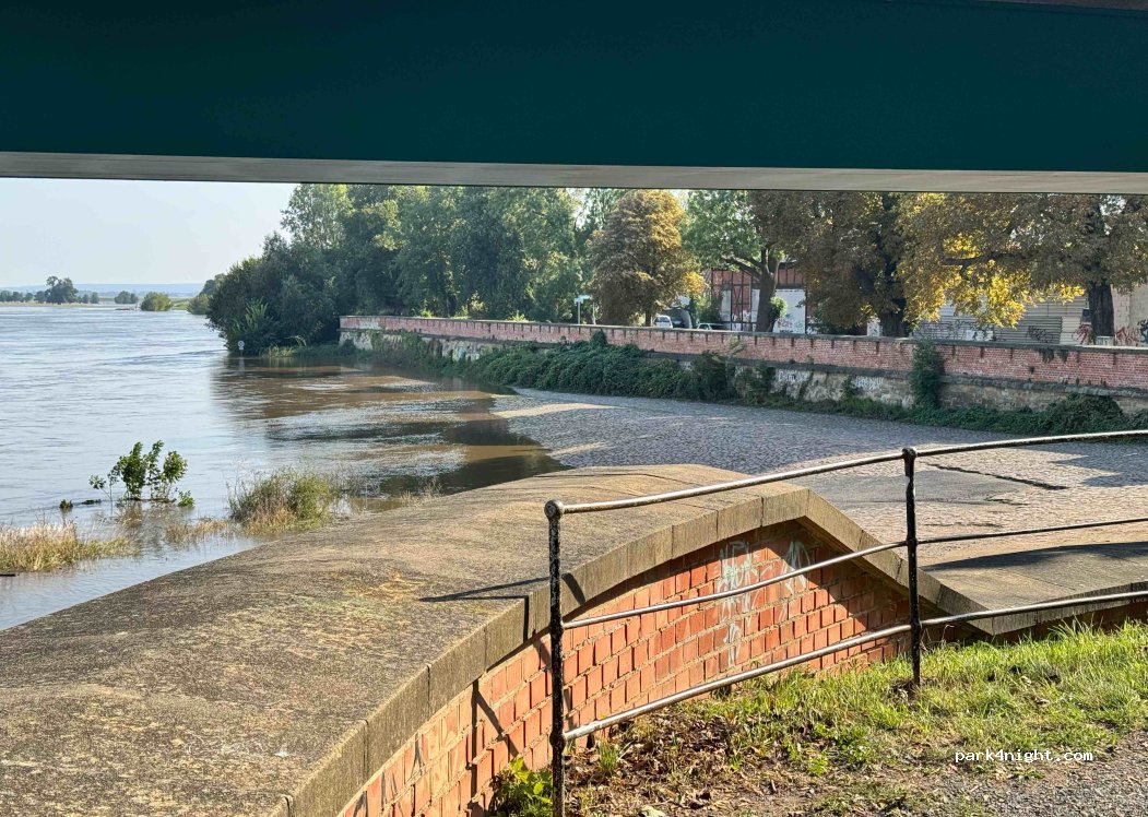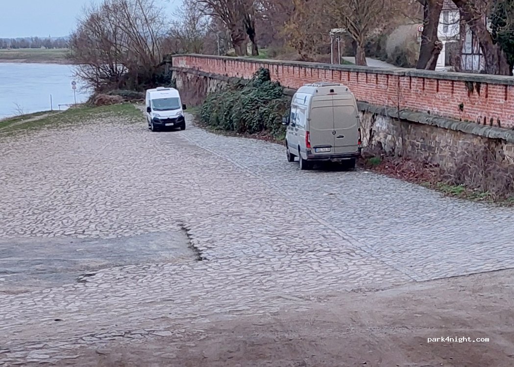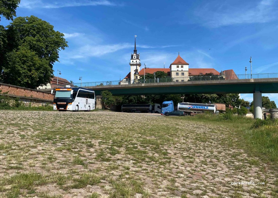 Large parking lot right on the banks of the Elbe, right next to the Elbe bridge. Slightly sloping, also suitable for large vehicles. about 6-7 minutes walk to the city center, 3 minutes to the castle.