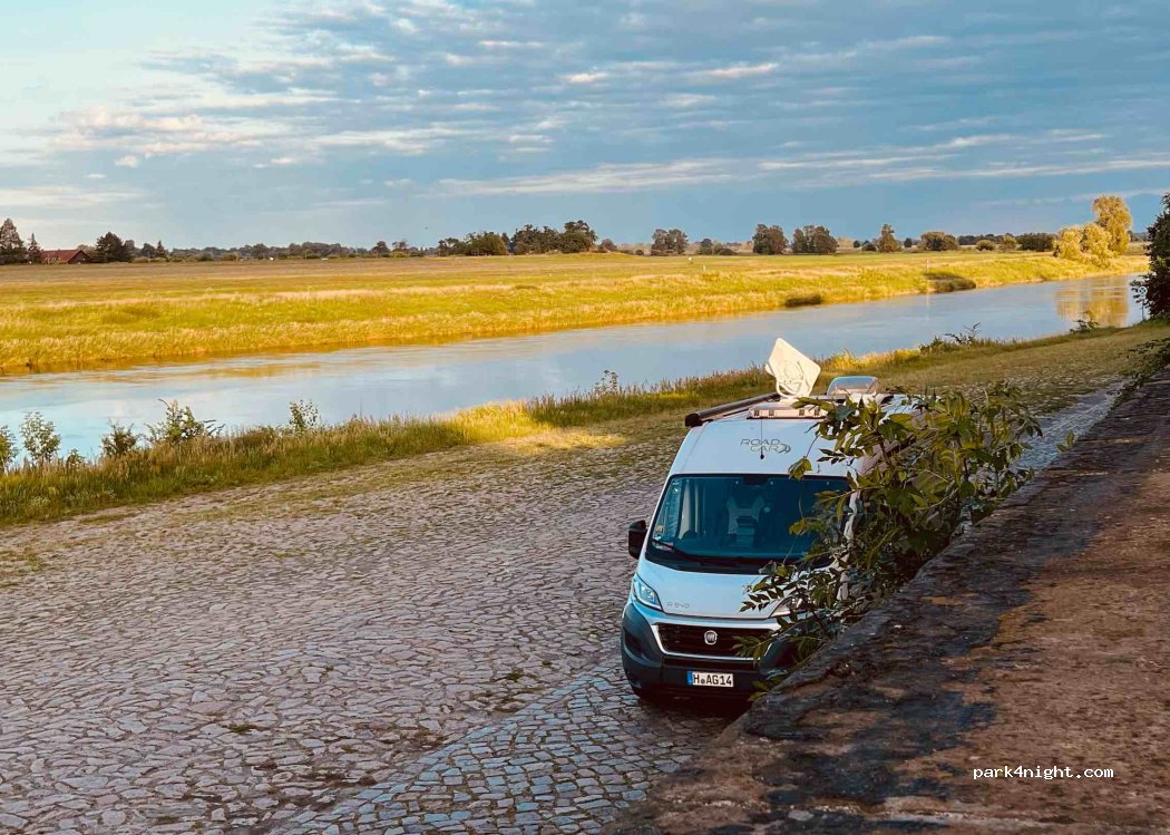 Ein wunderbarer großer Platz für eine Nacht. Im Dunklen angekommen, Verkehr auf Brücke leise, am Morgen früh aufgewacht und einen herrlichen Sonnenaufgang über der Elbe erlebt -im Hintergrund das Schloss und mittendrin wir im Womo. Der Platz ist leicht abschüssig, oben an der Hecke steht man relativ gerade. Platz ist gratis inklusive großer Brombeerhecke,lecker zum Frühstück im Sonnenschein.