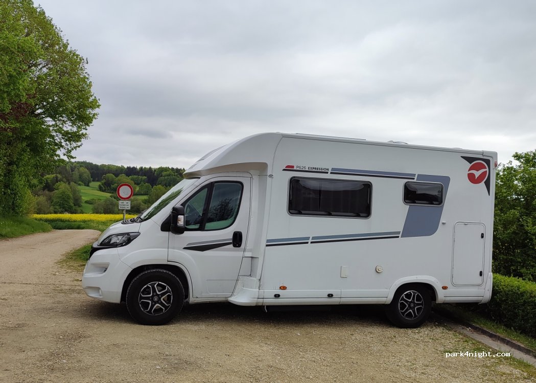 Ziemlich ebener geschotterter Wanderparkplatz neben einer kleinen wenig befahrenen Straße oberhalb des Dorfes. Waldgaststätte 500 m, 2 Gasthöfe im Dorf. Angrenzend ein Spielplatz. Schöne Aussicht.