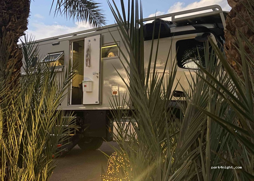 Ein sehr ruhiger Platz und neben den Palmen gibt es schattige Plätze. Auch die Höhe von 3,64 m ist kein Problem. Der angebotene Tajine Hähnchen Zitrone ist wirklich empfehlenswert und auch für uns die bisher Beste, die wir gegessen haben. Der Brotservice am Morgen ist auch prima. An einem Gebäude wird gerade etwas gewerkelt, was aber die Nachmittags- und Nachtruhe nicht stört.