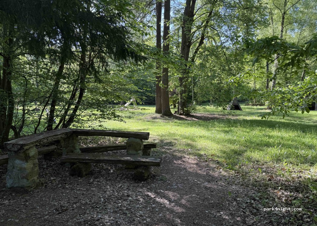 Parking dans la forêt avec des sièges, des poubelles et une aire de jeux.