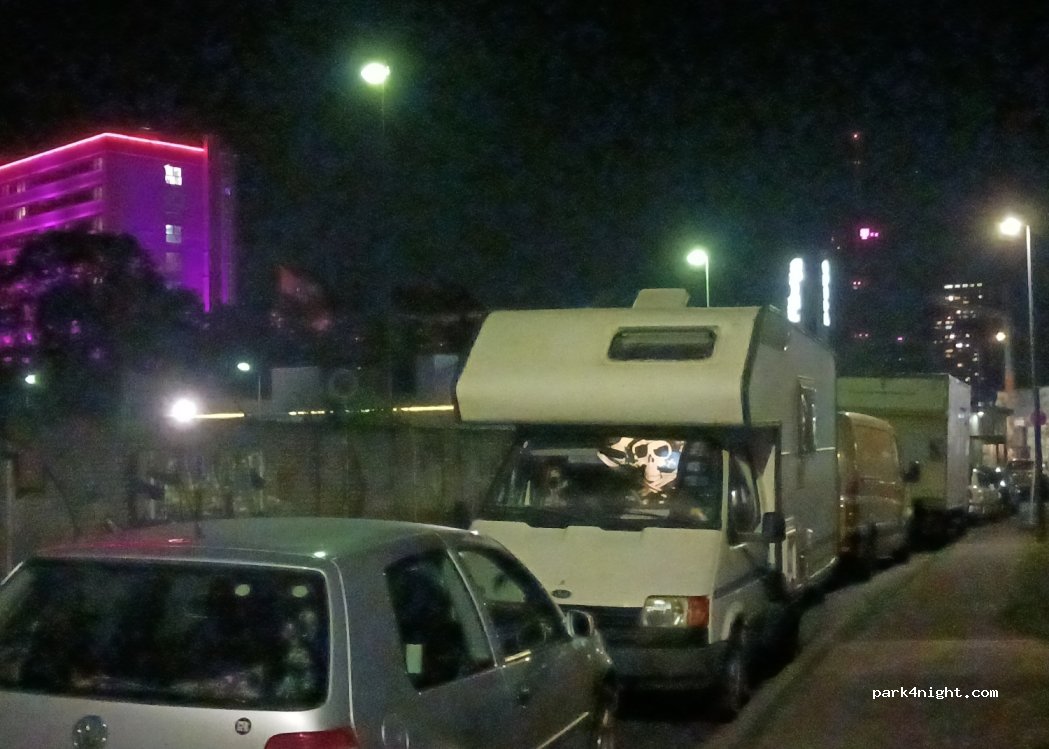 Located next to a supermarket (lidl), there is a local brothel, a nightclub and a tram stop nearby. I was here for 2 days, but it is not very recommended if you are alone: drunk homeless people, crazy people hitting my motorhome, people shouting in the streets mainly between 19:00 and 22:30.