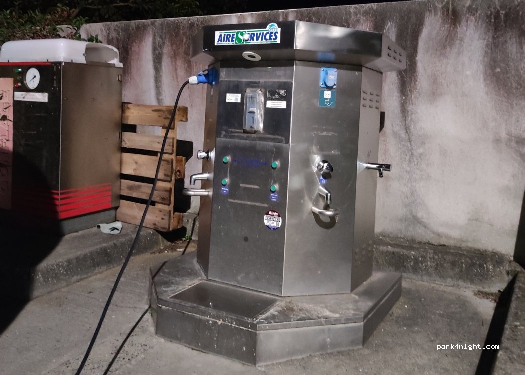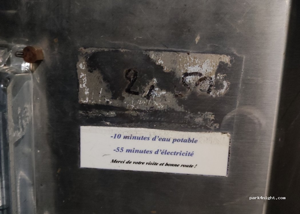 Abwasser-, Trinkwasser- und Strom-Servicestelle an der Super U-Tankstelle. Gleich nach den Zapfsäulen auf der rechten Seite. 2,50 Euro für 55 Minuten Strom und 10 Minuten Trinkwasser (während dieser Zeit können Sie Ihre WC-Kassette über den Trinkwasserhahn reinigen. 10 Minuten steht drin, tatsächlich dauert es aber etwas länger.