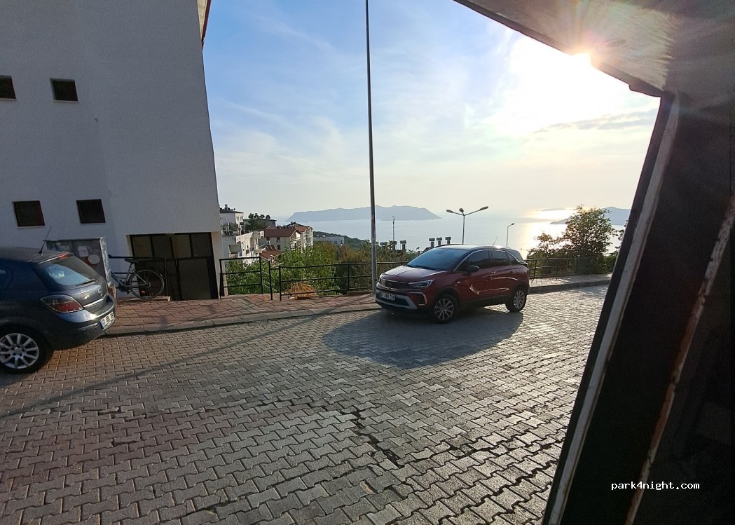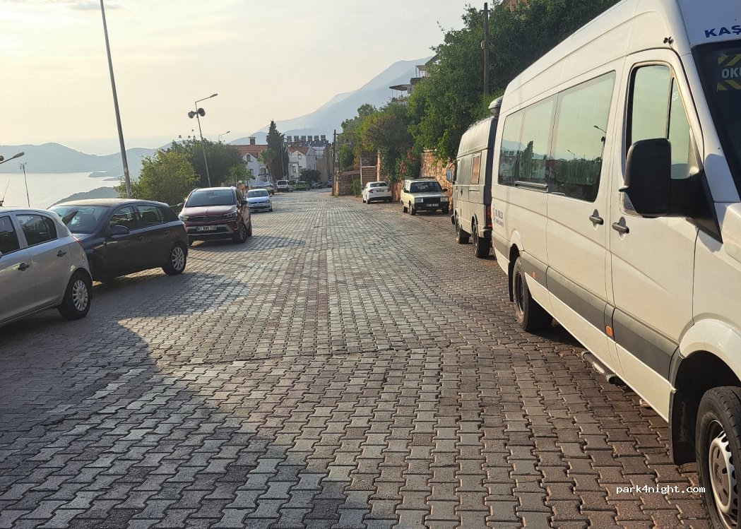 Wide street with parking spaces at the top of Kas, nice view of the sea but a bit of hike back up, many steps. parking is quite limited near the sea. A101 and Migros on the same street 2 minutes walk. Bins nearby. Easy to enter from the main highway turn where the Migros Jet is. DONT drive from bottom of town, the hill is really steep.