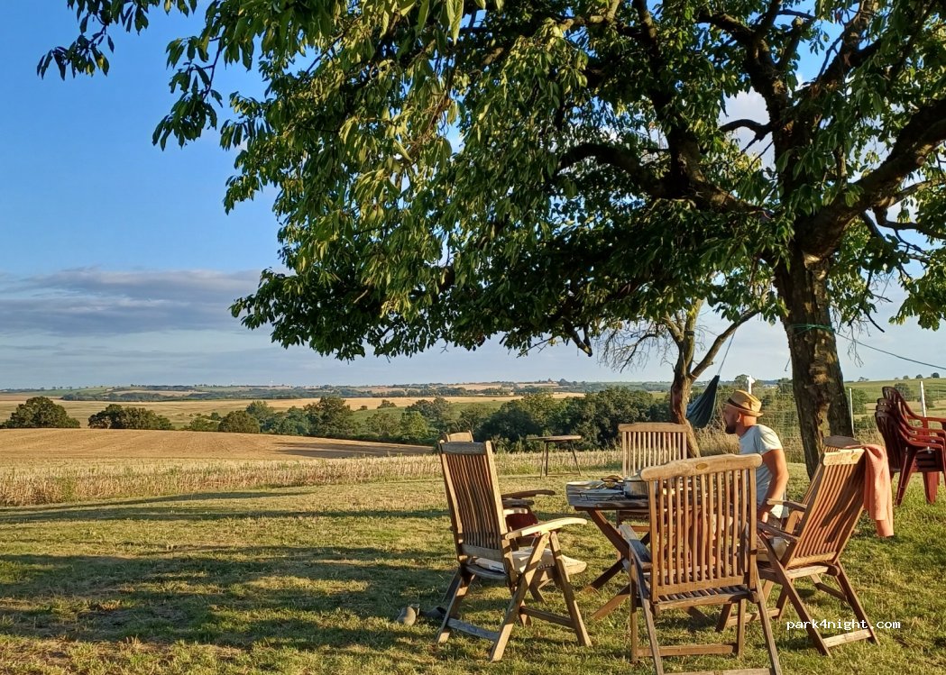 Nous étions venus pour 1 nuit. Nous avons été charmé par le lieu. Nous sommes restés 3 nuits. C'est un endroit très calme en pleine campagne. Les fruits et légumes des arbres et du potager en libre service. La propriétaire est super sympathique et propose des oeufs à la vente. Il y a un BBQ, un foyer pour le feu, des toilettes sèches,un lavoir à l'ancienne, une table de pique nique immense...