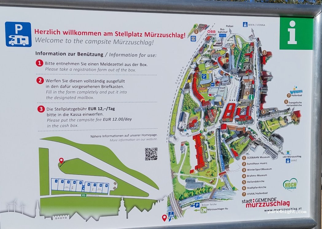 The RV parking spaces are located in Mürzzuschlag right near the town square. Information is available from the Mürzzuschlag town hall.