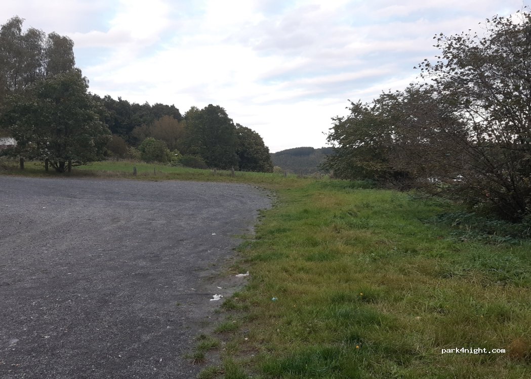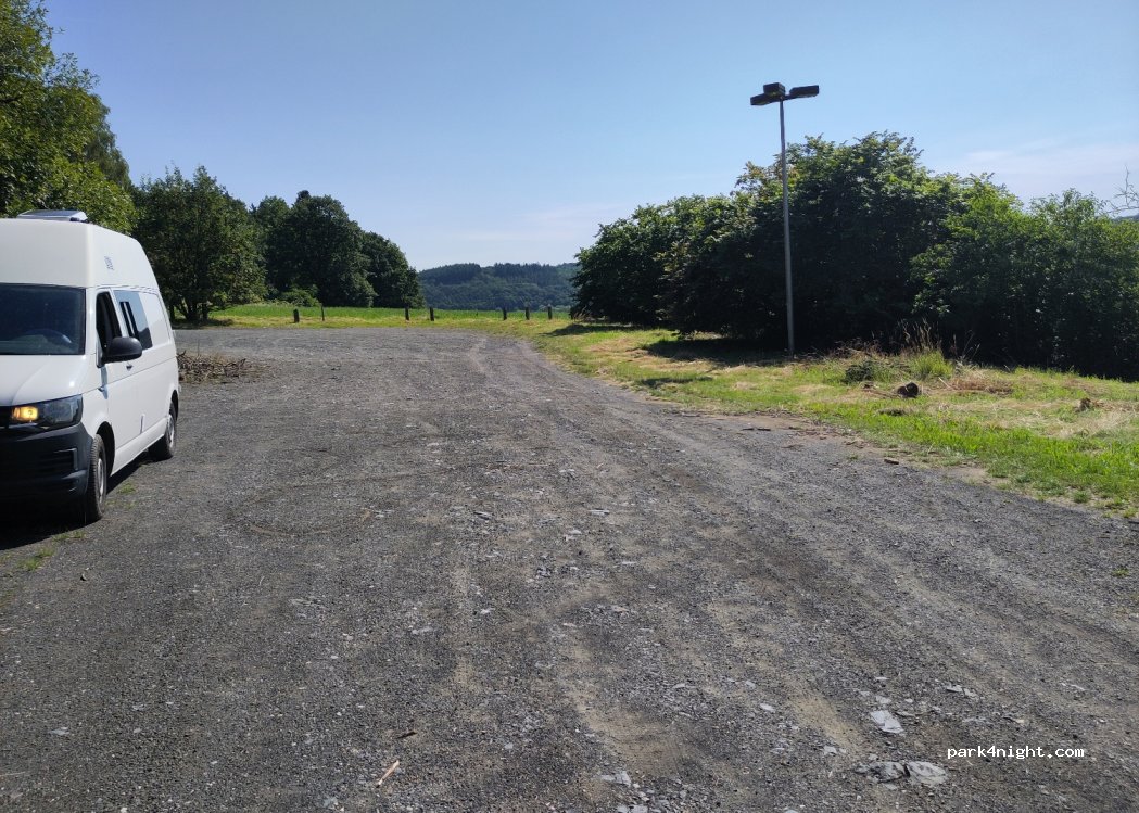 Hikers' car park, partly a bit slanted, but easily leveled. Gravel, on the edge of the forest, very nice view towards Gießen across the country. About 200m away there is a former hotel, now perhaps refugees?