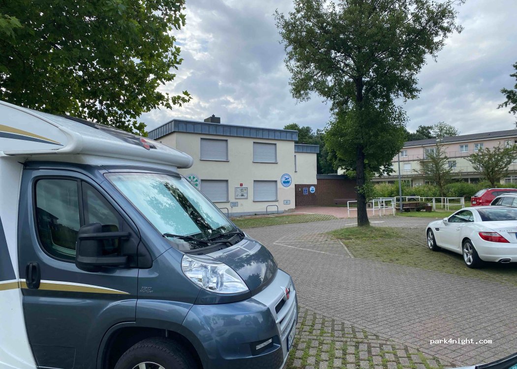 2 Stellplätze für Wohnmobile auf dem Parkplatz vor einem Freibad, gut für eine Übernachtung, nett dass es offiziell möglich ist, am Morgen füllt sich der Parkplatz schnell mit Gästen