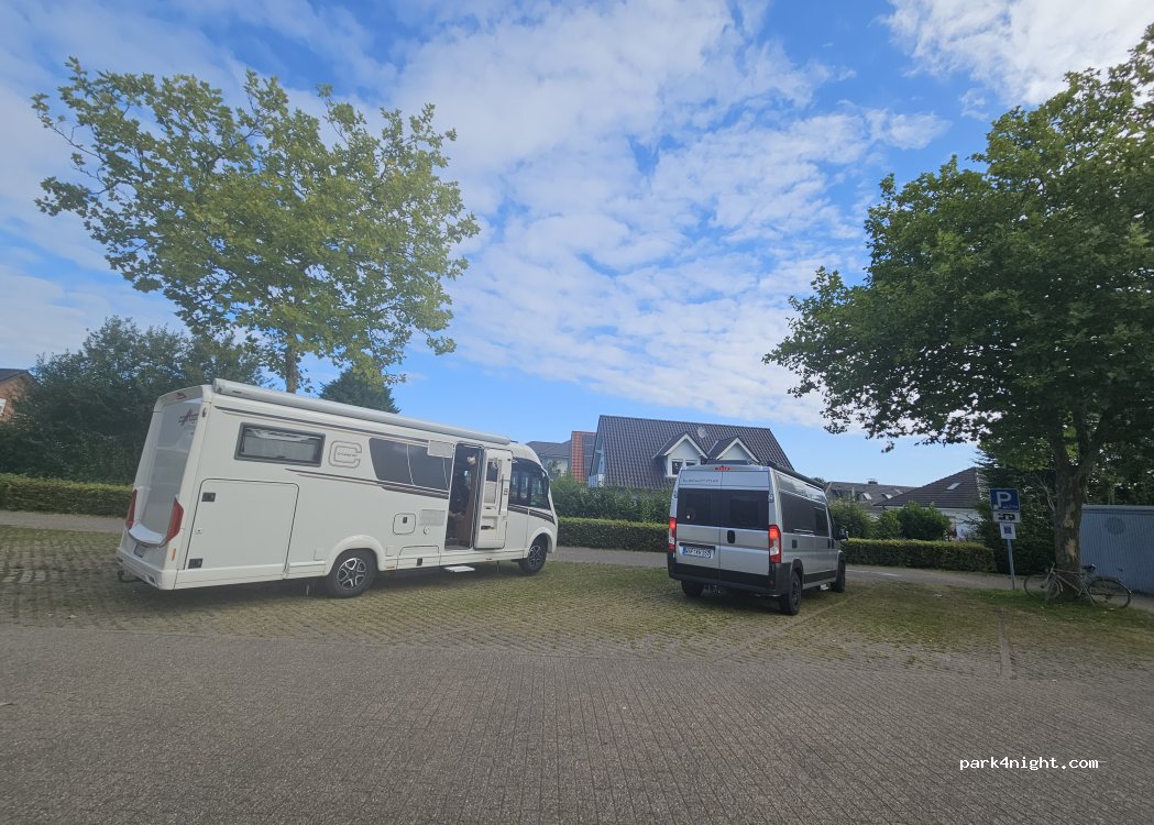 Parking gratuit au bord d'un quartier résidentiel? près du centre de Westerkappeln avec deux places de parking réservées aux campeurs.