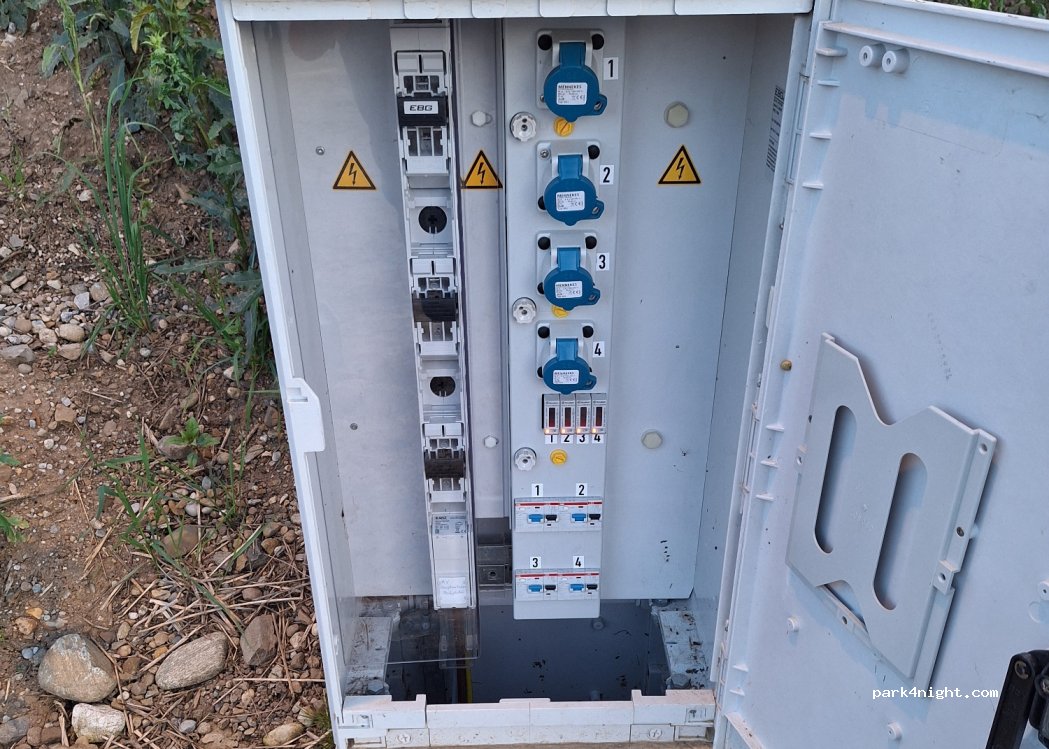 L'électricité est disponible : Il y a un panneau « borne de recharge », en dessous se trouve une boîte grise que vous pouvez ouvrir.